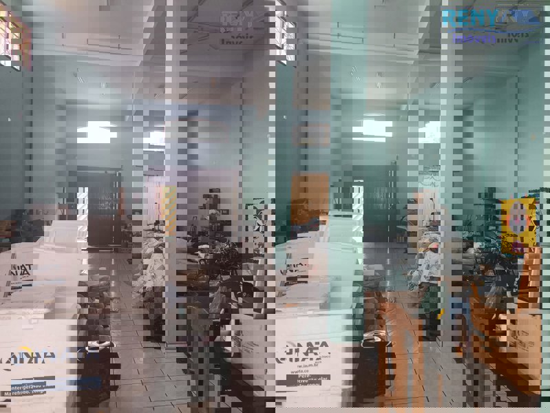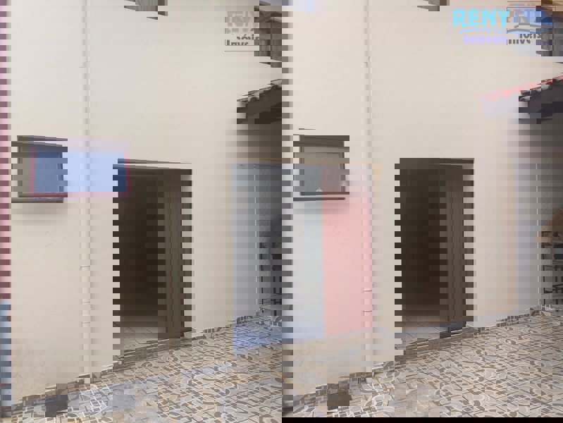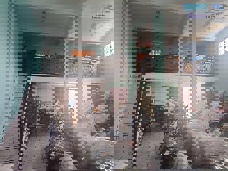 Salão com aproximadamente 220 m², com mezanino, dois banheiros e cozinha, quintal com churrasqueira e pia.